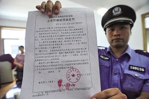 民警随后联系到狗的主人,他最终同意将大型犬交由警方没收。这只黄色大狗被带出门头房时,记者发现它的嘴巴被缠上了胶带。“主要是防止一时控制不住,冲出去咬人。”民警介绍。黄色大狗的主人牵着它走出市场时,它看着周围的人群,身体不时扭动一下,有的人吓得远远躲开了。随后,这只黄色大狗被送进了车上的铁笼子里。“这是一只大型犬,也是一只烈性犬。”民警介绍,从2010年3月开始,这名业户就开始饲养这只黄色大狗,按照规定这是不允许饲养的。所以,除了没收犬只,还将由派出所给予其罚款2000元的处罚。市中公安分局四里村派出所的民警拿着“行政处罚决定书”告诉记者,这是济南警方整治违法养犬专项行动以来,开出的首张“罚单”。