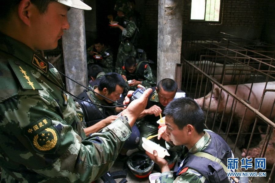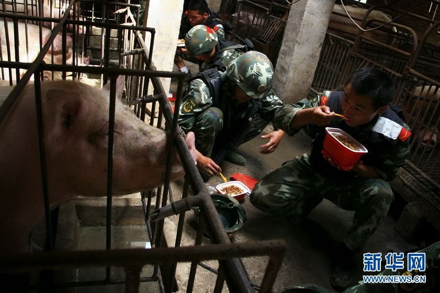 5月16日至5月22日,在新乡辉县太行山深处,武警河南总队采取多课目、高难度、超负荷的方式,组织36名特战队员进行了连续7昼夜,行程380公里,融体能、技能、战术、心理、意志于一体的“魔鬼周”训练。图为士兵在猪圈里就餐。