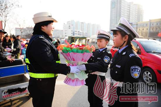 3月7日下午4时,在河东区东兴路临沂第九实验小学值勤的河东交警女子“护卫天使岗”收到一份特殊的礼物,4名临沂第九实验小学的小交警为正在值勤的女警送上鲜花,祝福女警们“三八”妇女节节日快乐,感谢她们一年四季无论炎热酷暑或者严寒风雨坚持助学岗,保护学生上放学安全。