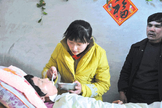 上苍或许被郭焕如的孝心所打动——母亲在昏迷了18天后,终于奇迹般睁开了眼睛,而且还能做出一些简单反应,25天后转入普通病房。母亲逃离了冰冷的监护室,可是护理难题又来了——身上插满管子,需要注射流食、定时吸痰、拍背、倒尿,于是郭焕如就天天跟护士学习、向其他病人家属请教,很快掌握了护理要领。