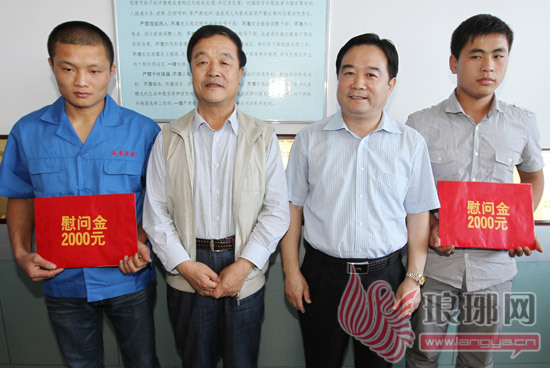 市委常委、政法委书记张广敬(右二)和市见义勇为基金会会长李荣强(右三)看望了李涛(左一)和诸葛瑞春(右一)。