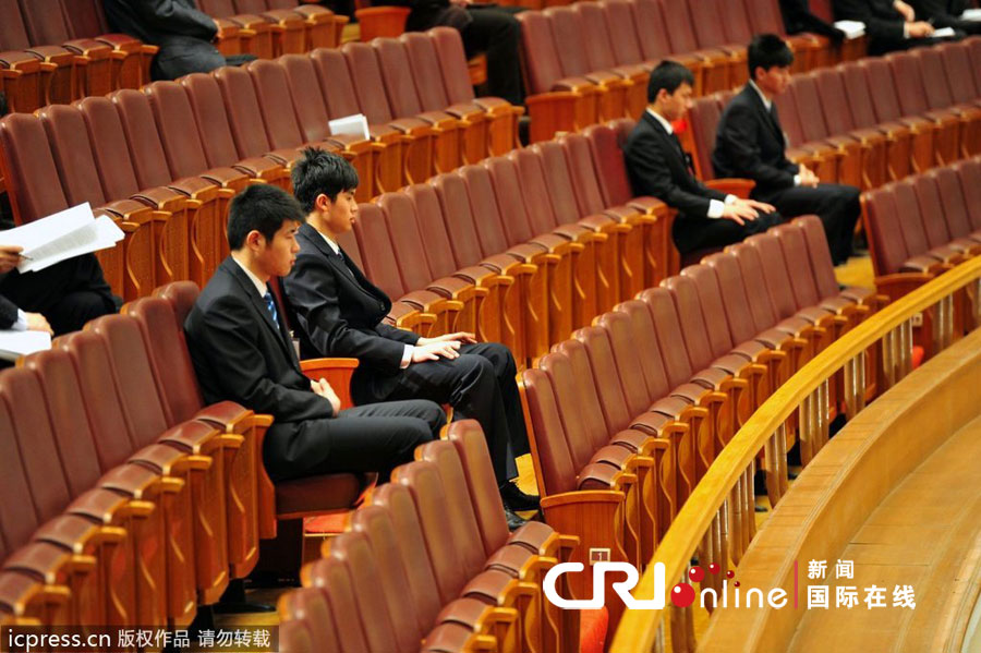 2012年3月9日,2012年全国两会在北京举行。身着黑色西装的工作人员。