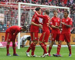 德甲上次半场5比0也是拜仁创造(2005年5月15日6比3胜纽伦堡)。易边后,季莫舒克替下博阿滕,古斯塔沃改打中卫。下半时开始仅132秒,罗本右侧开出角球,戈麦斯后点距门5米处头球入网,6比0!他以11个帽子戏法超越布格斯穆勒和海因克斯(10次),仅次于盖德-穆勒(32次)和菲舍尔(12次)。第50分钟,阿拉巴远射偏出近角。第54分钟,阿拉巴左路传中,巴德斯图伯后点头球吊射被施塔克指尖一托击中横梁。