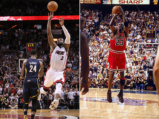 韦德穿着跟当年乔丹一样的球鞋重演绝杀一幕