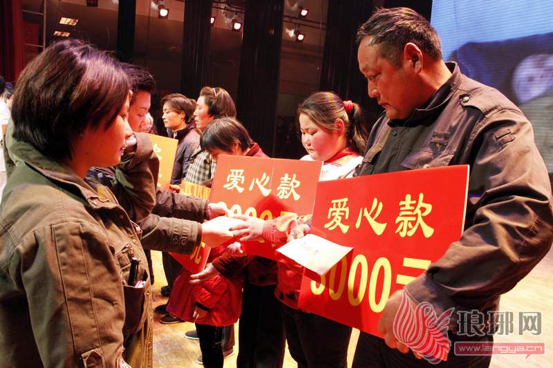 晚会现场有13位贫困母亲各领取了3000元慰问款。台下的观众自发地走上舞台,将承载着无数爱心与希翼的爱心款投进箱里。舞台两侧的台阶一度因为爱心观众潮水般涌来而显得狭窄、拥堵。