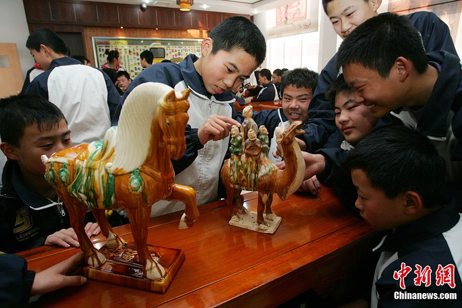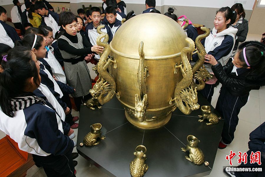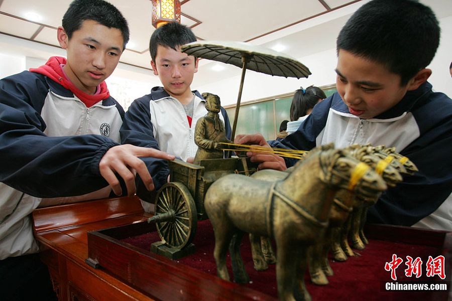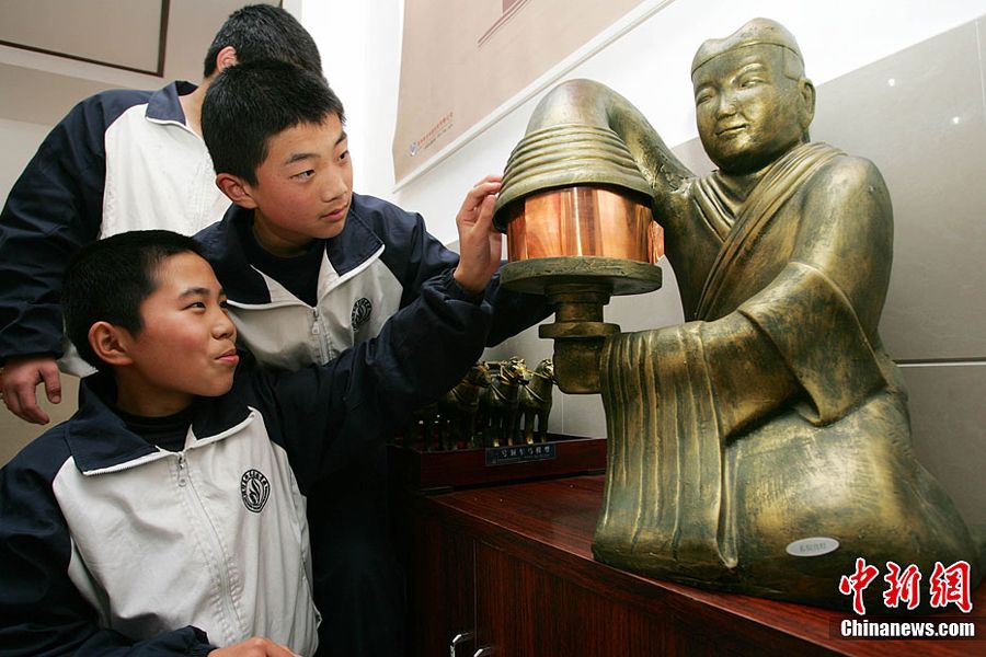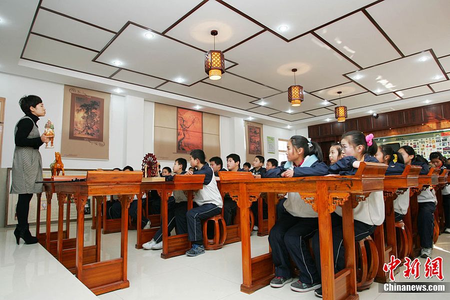 日前,山东潍坊高新区实验学校投资25万元建成了中学历史专用教室。该教室不仅有张衡地动仪等39件古代文物的复原模型,连教室里学生用的桌子、凳子和灯具都是仿古条桌、仿古鼓凳、仿古灯具。