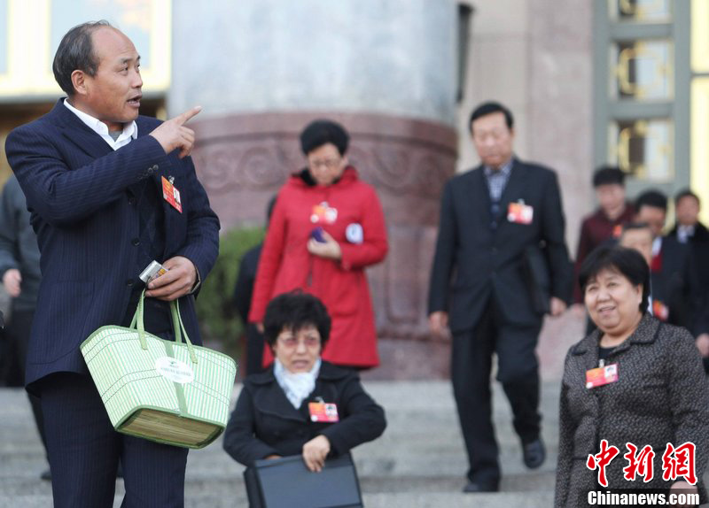 3月11日,北京,浙江代表团人大代表陈飞手挎竹简编织的菜篮子上两会,便于携带两会文字材料。