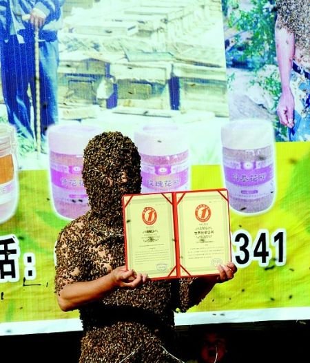 世界纪录协会高级认证师习操介绍,目前蜜蜂附身最重的世界纪录为60公斤,是2005年由一个哥伦比亚人创造的。