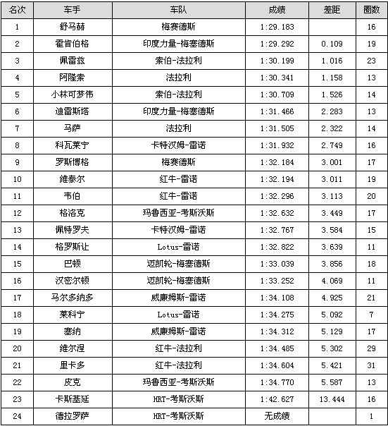 新浪体育讯 北京时间3月16日15:00,F1澳洲站二次练习结束,在一场先湿后干的90分钟的测试中,迈克尔-舒马赫最终以1:29.183名列全场最快,印度力量车手霍肯博格和索伯的佩雷兹分列二三。