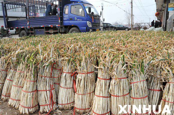 3月16日,在山东章丘市枣园镇史家村一批大葱准备装运。新华社记者徐速绘摄