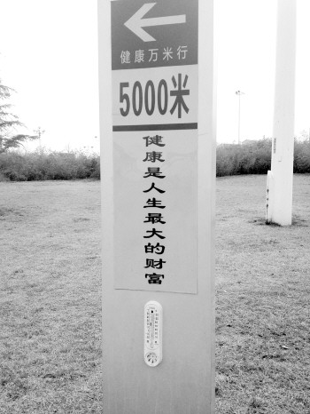 近日,记者在滨河景区采访时发现,“健康万米行”标志牌下方镶嵌的一支温度计不知去向。