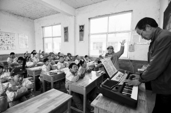 石沟联小的兼职音乐老师在教学生唱《春天在哪里》。