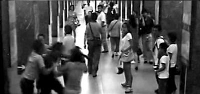 杨某(深色衣服)将男子(浅色衣服)推下地铁轨道。
