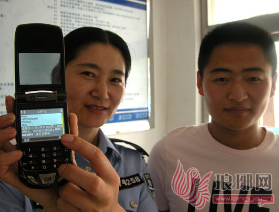 小李和民警展示收到的“温馨提示”的手机短信。