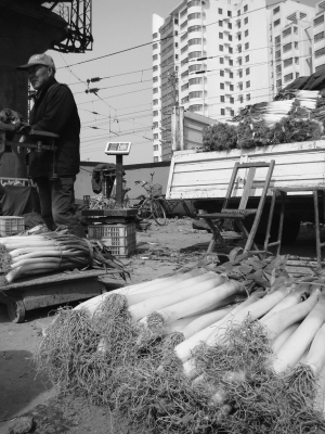 记者手记期待葱价跳出暴跌暴涨怪圈由于章丘大葱上市,省城葱价降了不少,图为省城一处大葱销售点