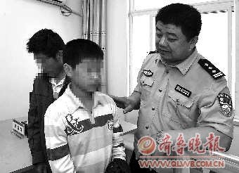 派出所里,警察正在耐心地对孩子进行批评教育。
