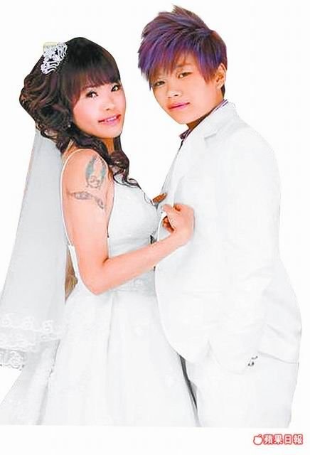 日前,小笨与小狗来台北度蜜月,她们在台北西门町里两人就像甜蜜的小情侣,打闹、调情,憨直的新郎小笨仅19岁,目前是饭店服务员;而身材火辣的新娘小狗25岁,则是发型设计师,他们说自小学起自觉是女“同志”,且早就向家人“出柜”(交代性倾向),两人在网络聊天室认识,5年来因家庭反对压力而分分合合,最后决定厮守一生。
