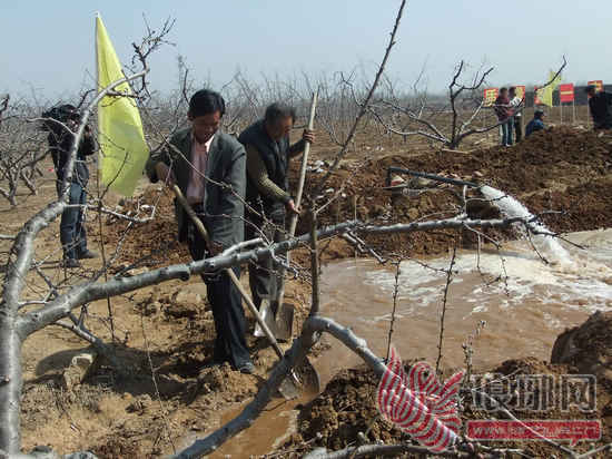 在平邑县地方镇大平安庄村,工作人员正在给已经出水的井进行配套,潺潺的清水从水管里不断地流出来,这口井处在多亩桃园中间,清水流成的水池让人看到了丰收希望。
