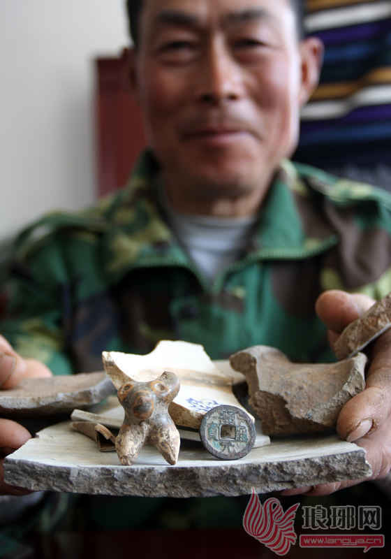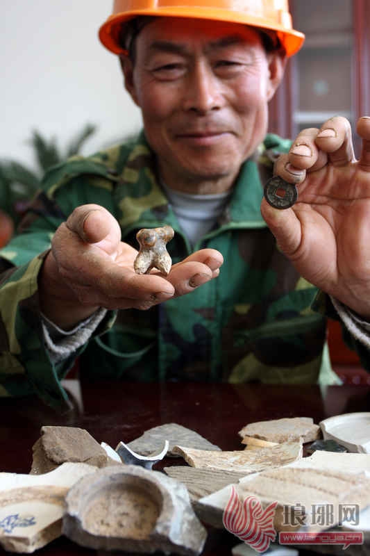 老王向记者展示在古井旁挖出的铜钱和瓷器瓦片等物品。