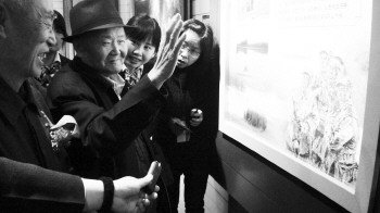 ◤战邮老同志赵永连(右二)向参观者讲述当年送文件的故事。