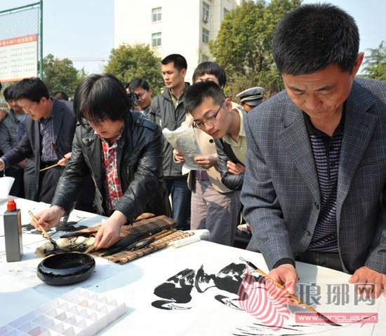 图2:4月7日,在兰山区兰山街道曹家王庄社区,艺术家现场为居民写书作画。