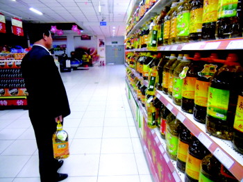 ◥市区金雀山路一超市内,一名市民挑选了一桶花生油。