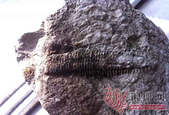 在陈先生提供的这块“化石”的照片上,记者看到好像是有一条虫子趴在石头上,看起来有很多骨节,样子和蜈蚣有些相似。