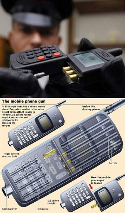 手机枪乍一看,它像一个普通手机。但是,其实这个手机是一个22口径的手枪,只要触摸一下标准键盘,手机枪可以连续射击四个回合。