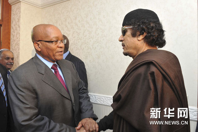 5月30日,利比亚领导人卡扎菲(右)在的黎波里会见南非总统祖马(左)。新华社/路透