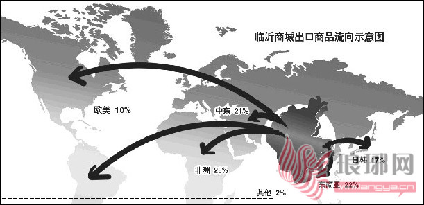 市区104处专业批发市场中,已有75个市场开展了国际贸易业务。中国市场学会批发市场发展委员会理事长齐东在分析商城国际化的优势市场时已有了清晰思路:以华东装饰板材市场、临沂不锈钢市场等为代表的具有当地产业支撑的市场;以华东塑料市场、临沂水暖洁具市场等为代表的周边市地产业集群市场;以华丰五金电子城、临沂站前商场等为代表的具有国际化经营潜力的市场;以文化产品市场、中药材市场等为代表的未来可发展市场。