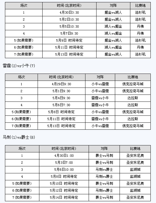 新浪体育讯 北京时间4月27日,2011-12赛季NBA常规赛最后一个比赛日。随着东西部季后赛首轮对阵出炉,赛程也已公布(陆续更新)。北京时间29日首战日中,雷霆小牛将亮相,而马刺湖人灰熊快船要第二日登场,以下为西部季后赛首轮各组对阵的全部比赛时间(均为北京时间):