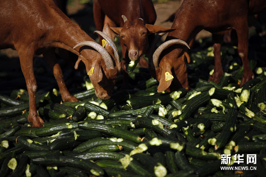 5月31日,在西班牙南部阿尔加罗沃的一家农场,山羊啃食被菜农丢弃的黄瓜。新华社/路透