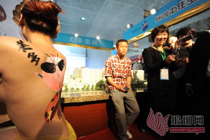 为吸引人们眼球,参展商带来了人体彩绘。 车明军 摄
