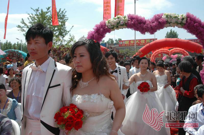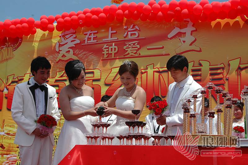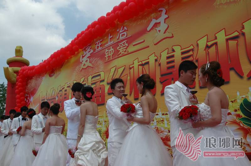 5月1日,费县上冶镇紫荆广场,笑语欢歌,礼花绽放,8对手捧鲜花的新人在县镇领导的主婚、证婚下,结为百年之好。上冶镇团委、妇联倡导“新农村、新风尚、新观念”,免费为农村新人打造了这场充满时尚和浪漫色彩的集体婚礼,镇政府还向每对新人赠送了价值近六百多元的结婚礼品。