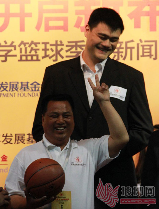 4月19日,姚明爱心基金正式宣布启动“2012姚基金希望小学篮球季”活动,作为全新的史丹利姚基金希望小学(临沭街道桃园完小),校长陈修普赶到活动现场,参加了新闻发布会。陈修普说:“姚明参加了新闻发布会,并且讲出了希望从小学一年级就培养篮球苗子的愿望。”讲完话后,姚明向35所学校,分别赠送了一个篮球。在这时,陈修普抓住机会,转过身和姚明合了一个影。看到他如此开朗,姚明也受到感染露出了笑容。
