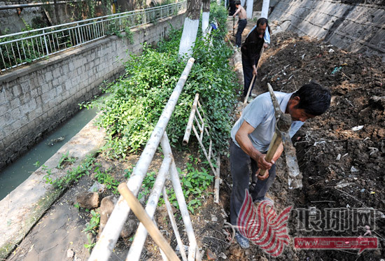 4日上午,记者在青龙河解放路段的施工现场看到,青龙河内的河水已泛起绿色,充斥着熏人的气味,在河道北侧,工人们正在挥舞着工具开挖老式的污水收集管道。正在现场负责施工的市排水处河涵管理科李成栋科长介绍说,三河因流经市区,大多周围居民区密布,一些居民将污水直排河中,污染了水质,同时排水设施也出现了不同程度的渗漏,从而使水质越变越差。此次对青龙河解放路段的改造,就是要将老式的污水收集管道进行更换,增大其排水能力,尽可能的减少污水进入青龙河。