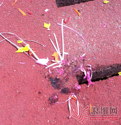 操场地面上还有血迹和气球的碎片。