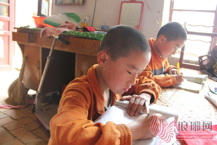 陈迪明、陈迪亮兄弟趴在床沿上写作业。
