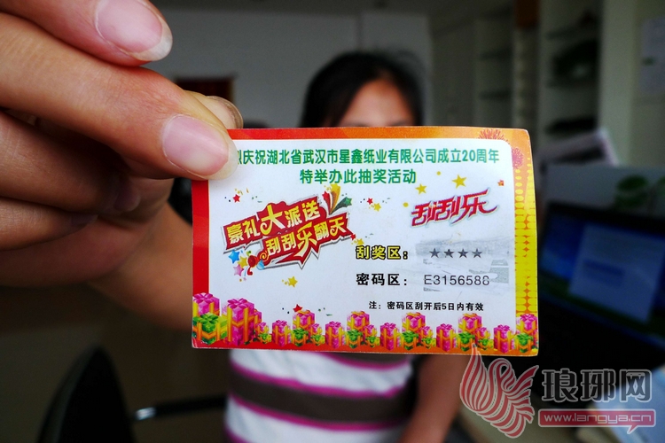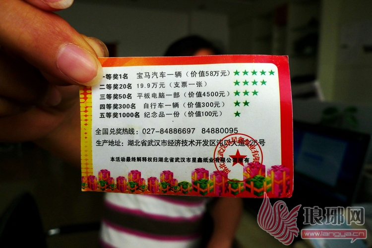 6日,记者见到了赵先生,他递给记者一张长约5厘米、宽约2.5厘米的纸片,称这就是他中“大奖”的刮刮乐卡片。记者看到,卡片一面印有“热烈庆祝湖北省武汉市星鑫纸业有限公司成立20周年特举办此抽奖活动”,而另一面则印有奖项和奖品,奖品包括宝马汽车,平板电脑等,看起来十分诱人。