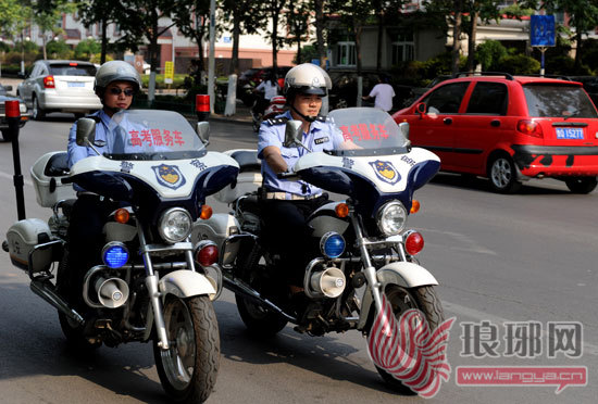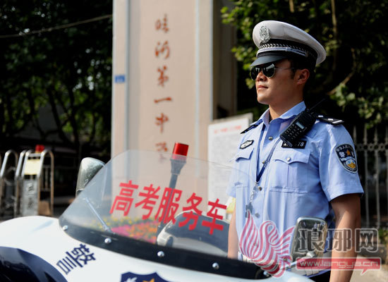民警在校园周边执勤,警车及摩托车上贴有“高考服务车”标识。