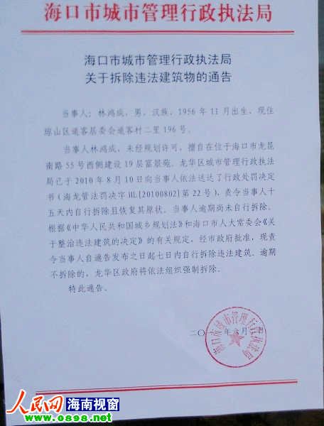 记者在这份《关于拆除违法建筑物的通告》中看到,“富景苑”当事人姓林,现居住道客村。通告认定,林某未经规划许可,擅自在位于海口市龙昆南路55号西侧建设19层富景苑。龙华区城管局已于2010年8月10日向当事人依法送达了行政处罚决定书,责令林某自拆且恢复原状。林某逾期不拆除。根据相关规定并报经海口市政府批准,责令林某自通告发布之日起七天内自行拆除违法建筑,逾期不拆,海口市龙华区政府将依法组织强制拆除。