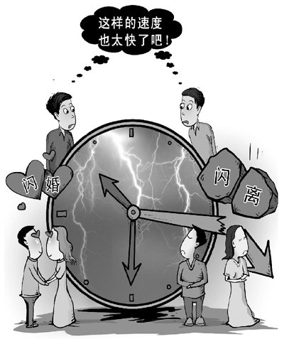 “一见钟情,婚了。一怒之下,离了。”北京市朝阳区婚姻登记处一位工作人员介绍,该处近年来登记的离婚夫妻中,35岁以下者超过一半。其中,“80后”又占多数,“闪离”现象日益突出。“有些人办手续时还在吵架,等拿到离婚证后,又抱在一起痛哭。”