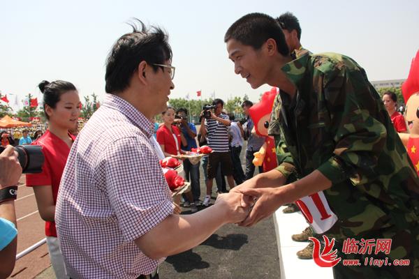 在上午11::00,在《运动员进行曲》激昂的旋律中,全国第一届大学生传统运动会第一块“金牌”颁奖仪式在体育场举行,临沂大学代表队的运动袁获得了鸡毛信男子和女子项目的金、银共四块奖牌。