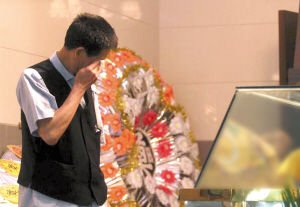 11:17,殡仪馆的工作人员将吴远碧的遗体推到了2号悼念厅,穿着寿衣,吴远碧跟平日里熟睡时一般,看上去很安详。“你们别进来,让我一个人在里面呆一下。”曹云辉拉住儿子,希望能够给他点时间。
