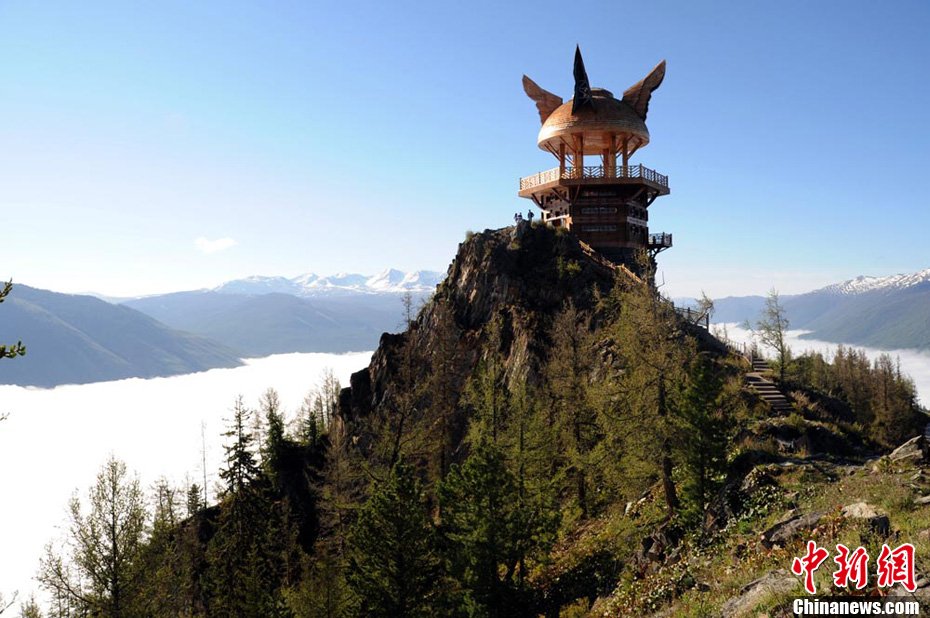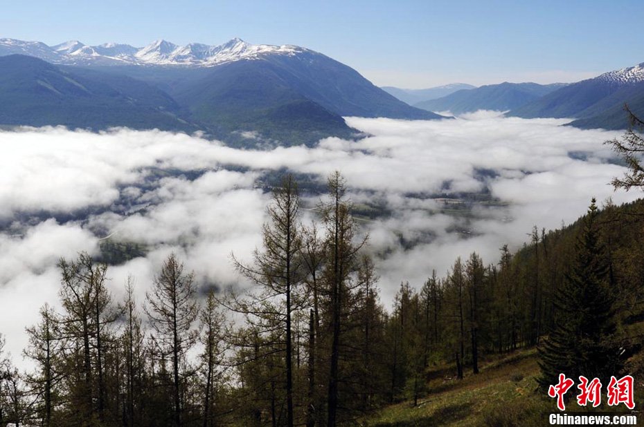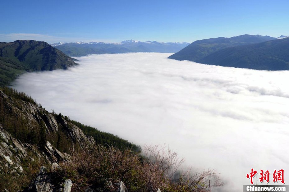 6月2日清晨,新疆著名旅游景点——喀纳斯湖出现浓雾填谷的云海奇观,令游客犹如置身人间仙境。站在该景区制高点观鱼亭举目远眺,云海像一条银色的丝带,飘舞在湖泊、山谷、林海之间,时而波涛汹涌、时而飘渺虚无。随着温度的升高,这一奇观在持续近五小时之后慢慢散去,喀纳斯湖才露出一泓碧水。据介绍,云海、佛光被誉为喀纳斯湖两大天象奇观,每年春季雨水丰沛的时候,极易出现浓雾填古的云海奇观。刘胜刚 杜雪娜 摄