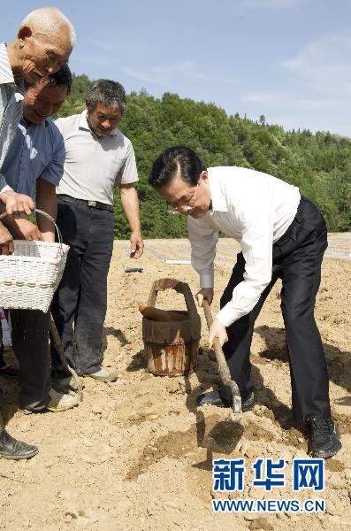 5月31日至6月3日,中共中央总书记、国家主席、中央军委主席胡锦涛在湖北考察工作。这是胡锦涛在视察受旱农田时,拿着锄头和村民一起补种玉米。新华社记者黄敬文摄