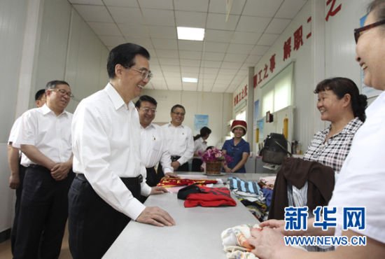 5月31日至6月3日,中共中央总书记、国家主席、中央军委主席胡锦涛在湖北考察工作。这是胡锦涛在武汉市青山区困难职工帮扶中心同前来领取免费衣物的困难职工亲切交谈。新华社发