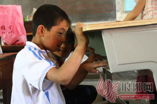 冯娟娟和几个学生观察仔细,她一边用手比量着新课桌桌洞的高度一边对周围的学生说:“你们看,这个桌洞很大,我们可以把书包放进桌洞了!”“是啊,真的!”周围的学生也急忙比划起来,“原来课桌的桌洞很小,有的还坏了,我们只能把书包挂在桌子上或直接放在地上,这回好了,可以把书包放进桌洞了!”