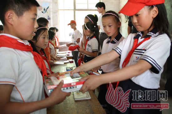 骏予学屋的孩子将自己带来的课外书赠于三峪联小的学生.