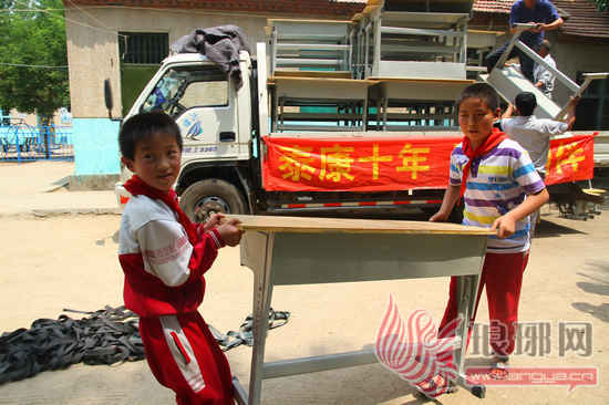 经过简短的捐赠仪式,泰康人寿临沂支公司总经理张振彬将课桌椅郑重的赠与岸堤镇中心小学校长杜以忠。“来,男同学们帮忙搬桌椅。”杜校长话音刚落,三峪联小的学生们“呼”的全部围到货车前,有的抬课桌,有的搬座椅,迫不及待的搬运起来。一张张喜悦的面庞、一个个忙碌的身影,一时间,欢乐的气氛在整个校园内晕散开。